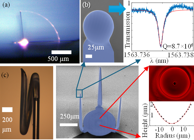 We fold micrometer-thick silica sheets into three-dimensional photonic devices on a silicon chip using a laser-induced local melting. Our structure contains parabolic micromirrors and microresonators with Q-factors exceeding 8 × 10⁶, which can be folded with milliradian resolution into knees and helices. This method extends silica photonics into the third dimension, providing a scalable, chip-compatible route to micro-optics for data processing, sensing, and precision tests of fundamental physics such as deviations from Newtonian gravity.